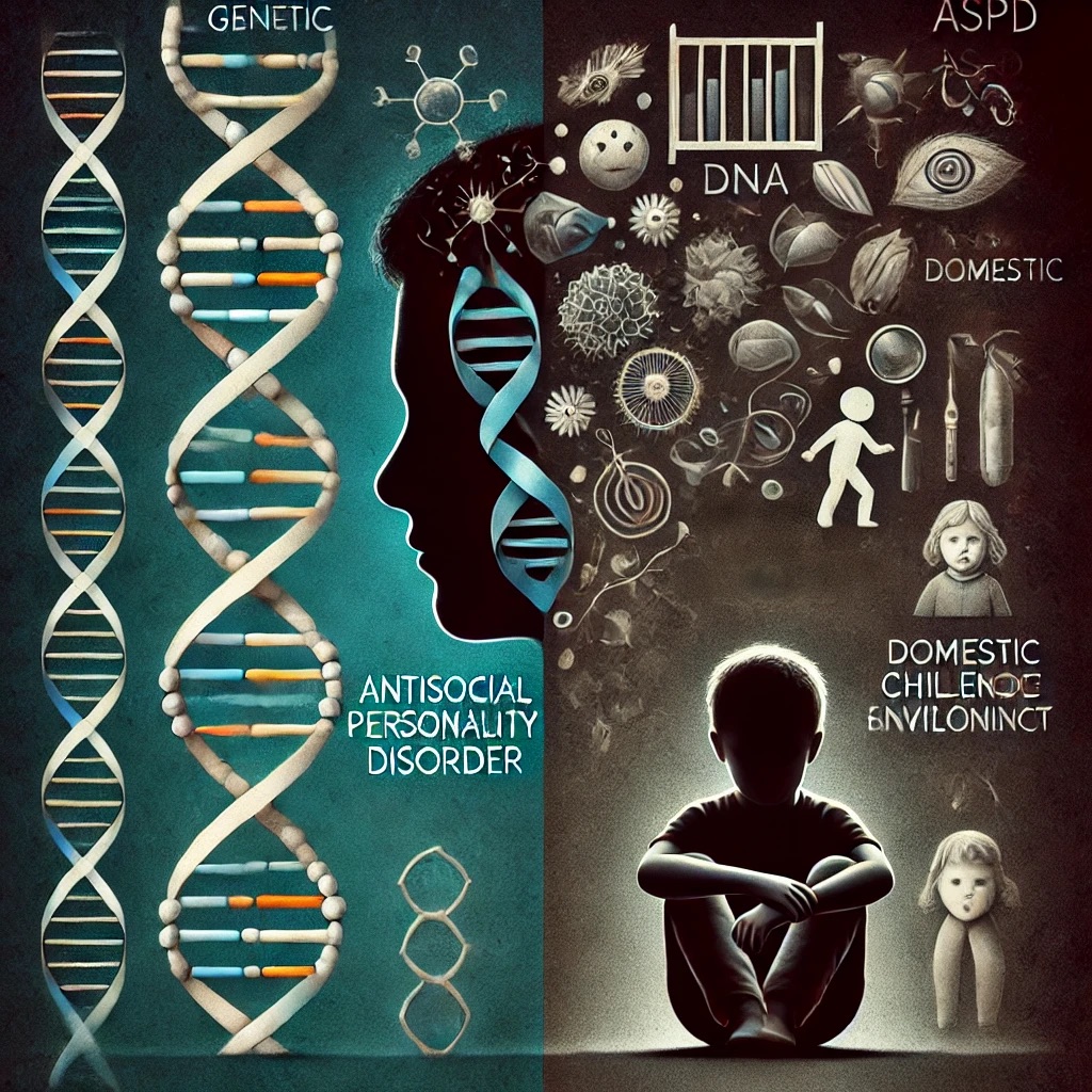 반사회성 성격장애는 가족력과 관련이 있으며, 특히 부모 중 한 명이 반사회적 행동을 보일 경우 자녀에게 영향을 미칠 가능성이 높습니다. 특정 유전자 변이가 관련될 수도 있다고 연구되고 있습니다.